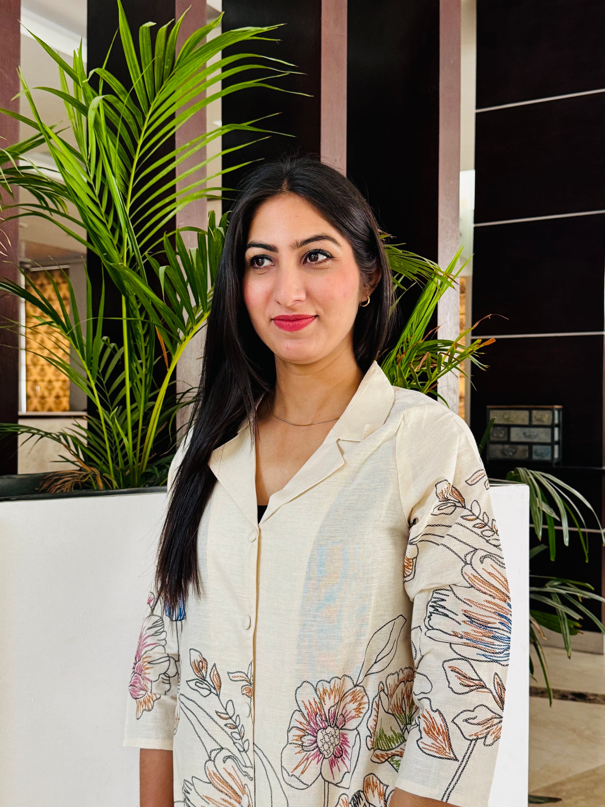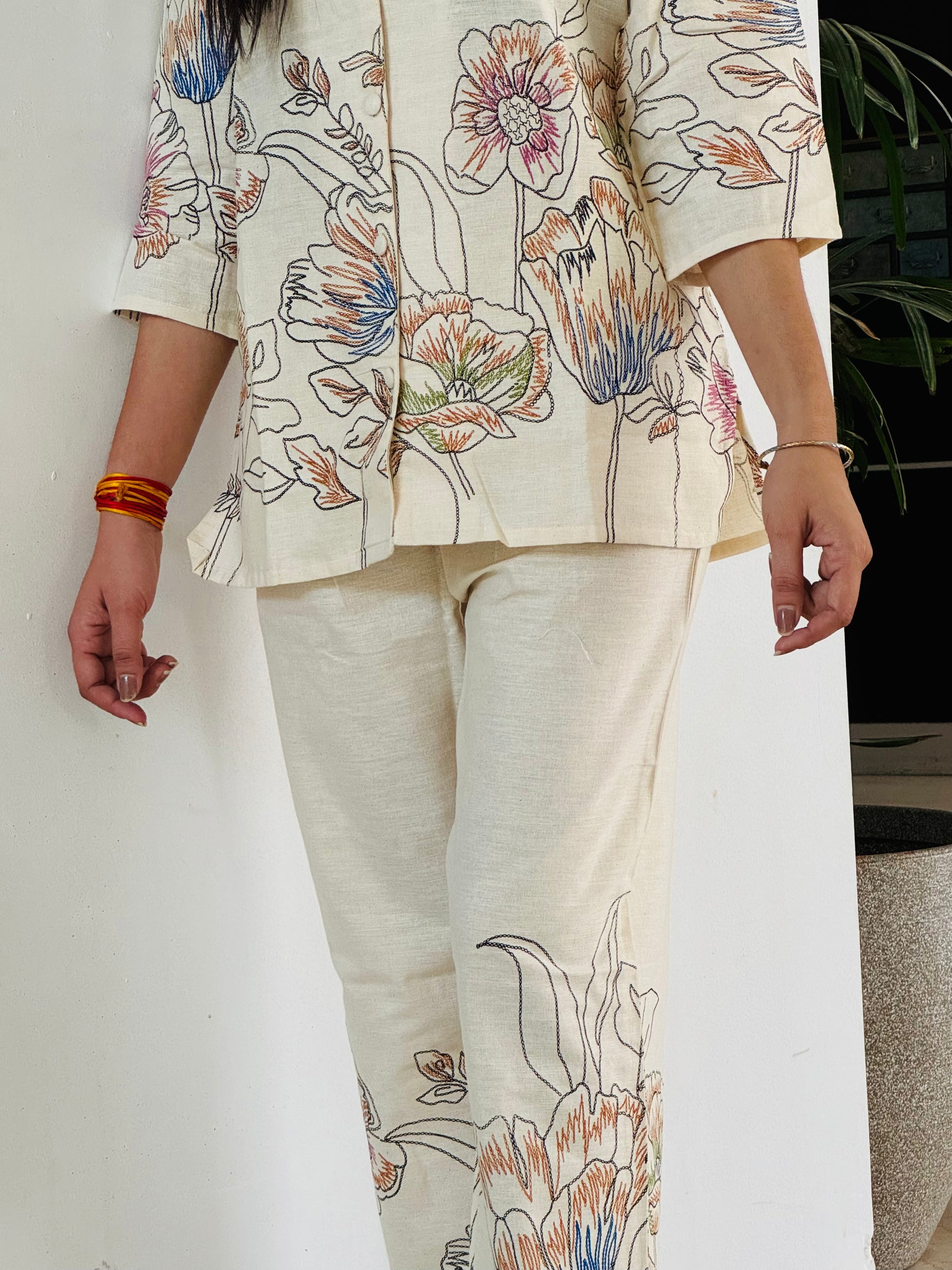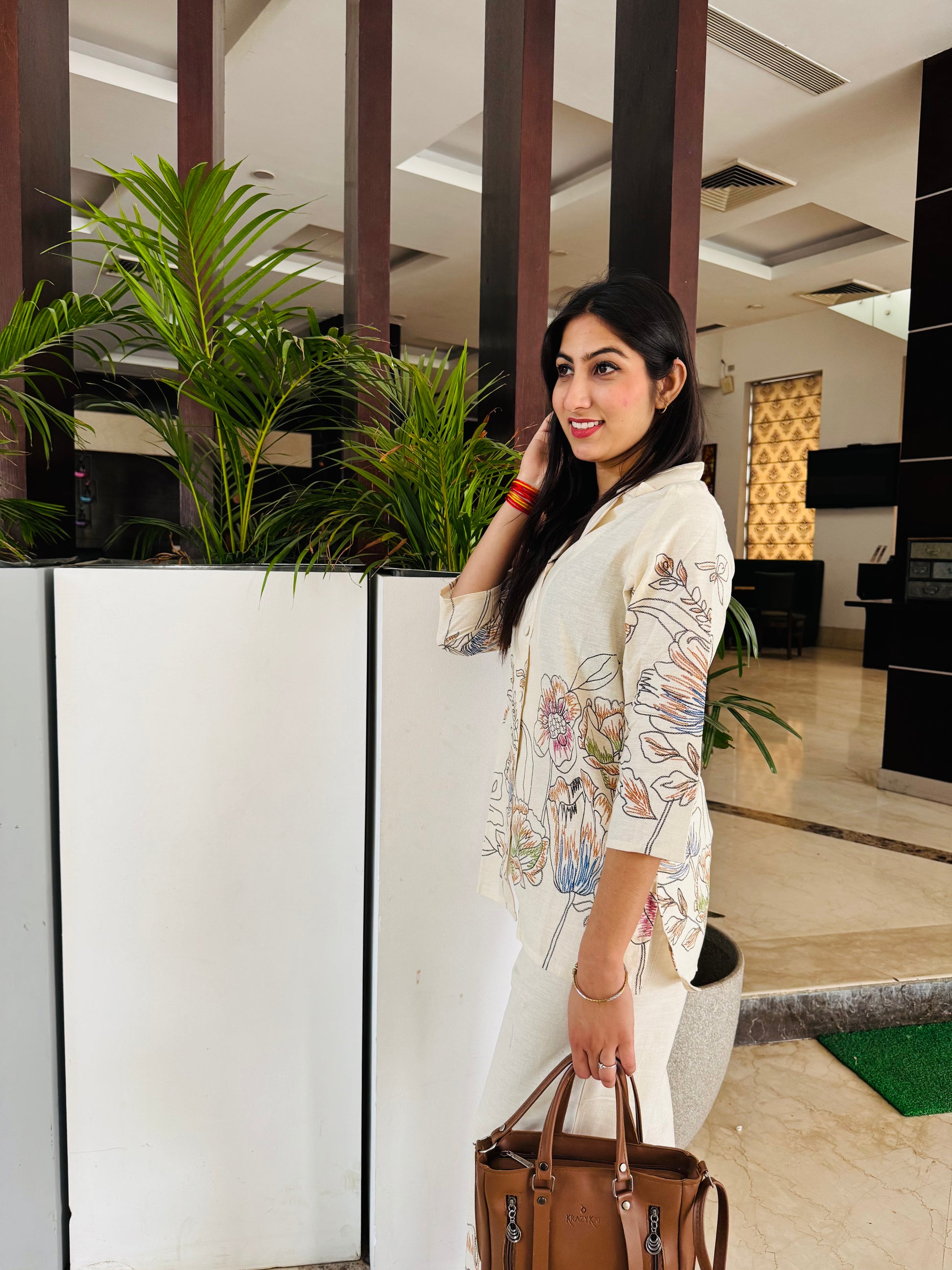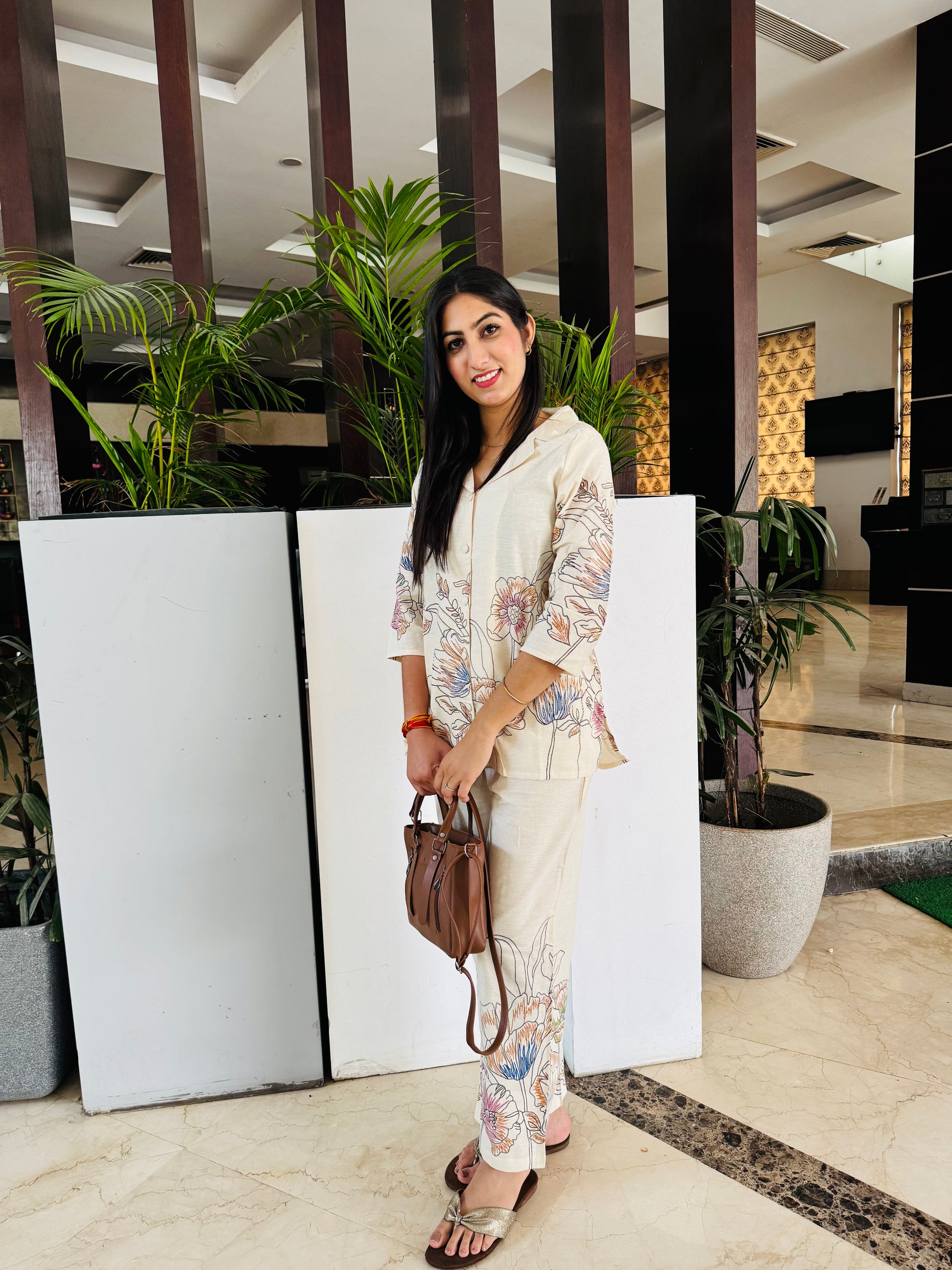 Step into effortless style with this chic floral printed co-ord set. Crafted from a soft and breathable cotton-linen blend, this two-piece outfit features a straight-cut top with a notched collar and front buttons, perfectly paired with relaxed-fit trousers. The delicate multicolored floral print adds a refreshing and graceful vibe, making it ideal for casual outings, office wear, or daytime events.