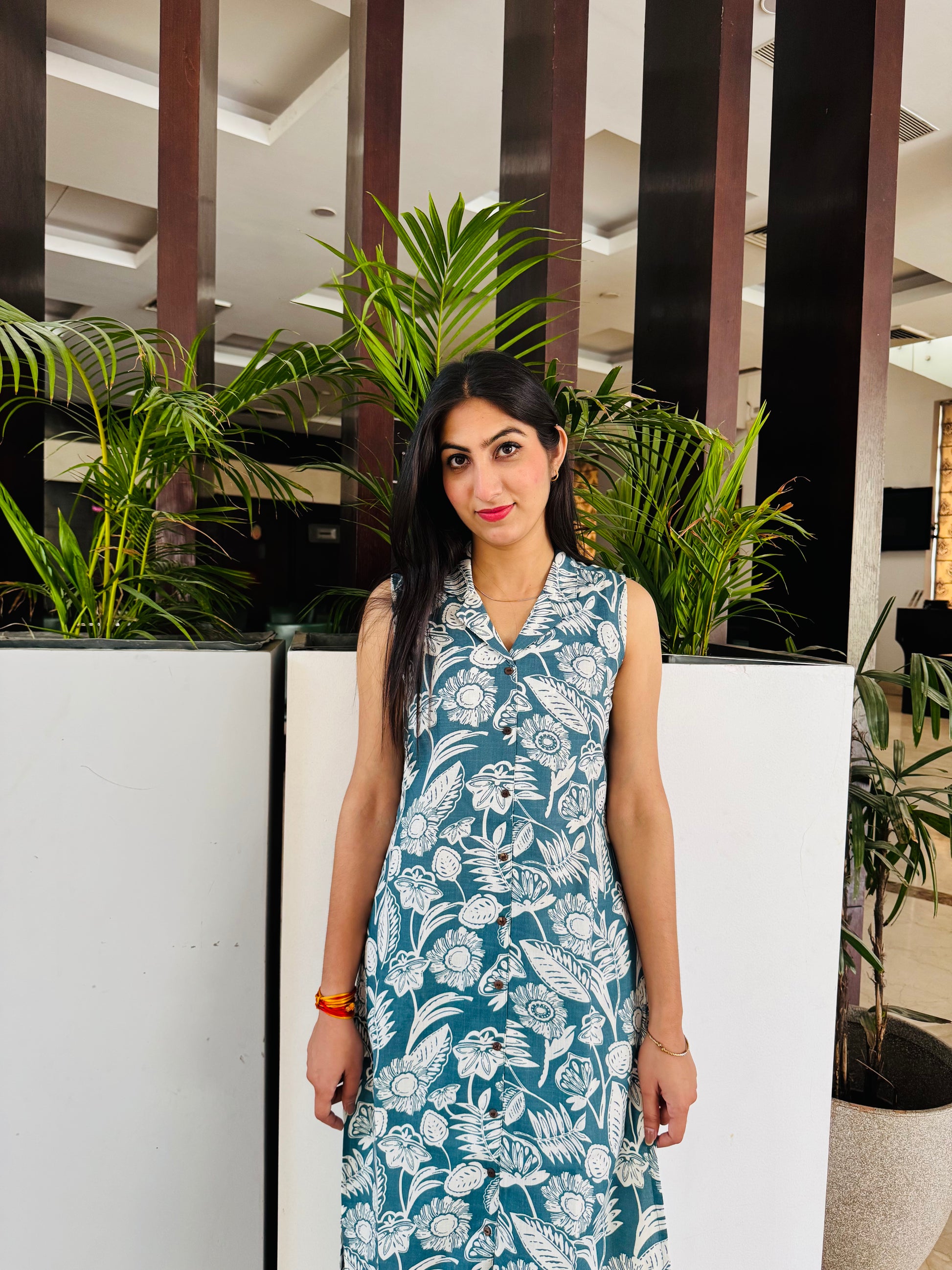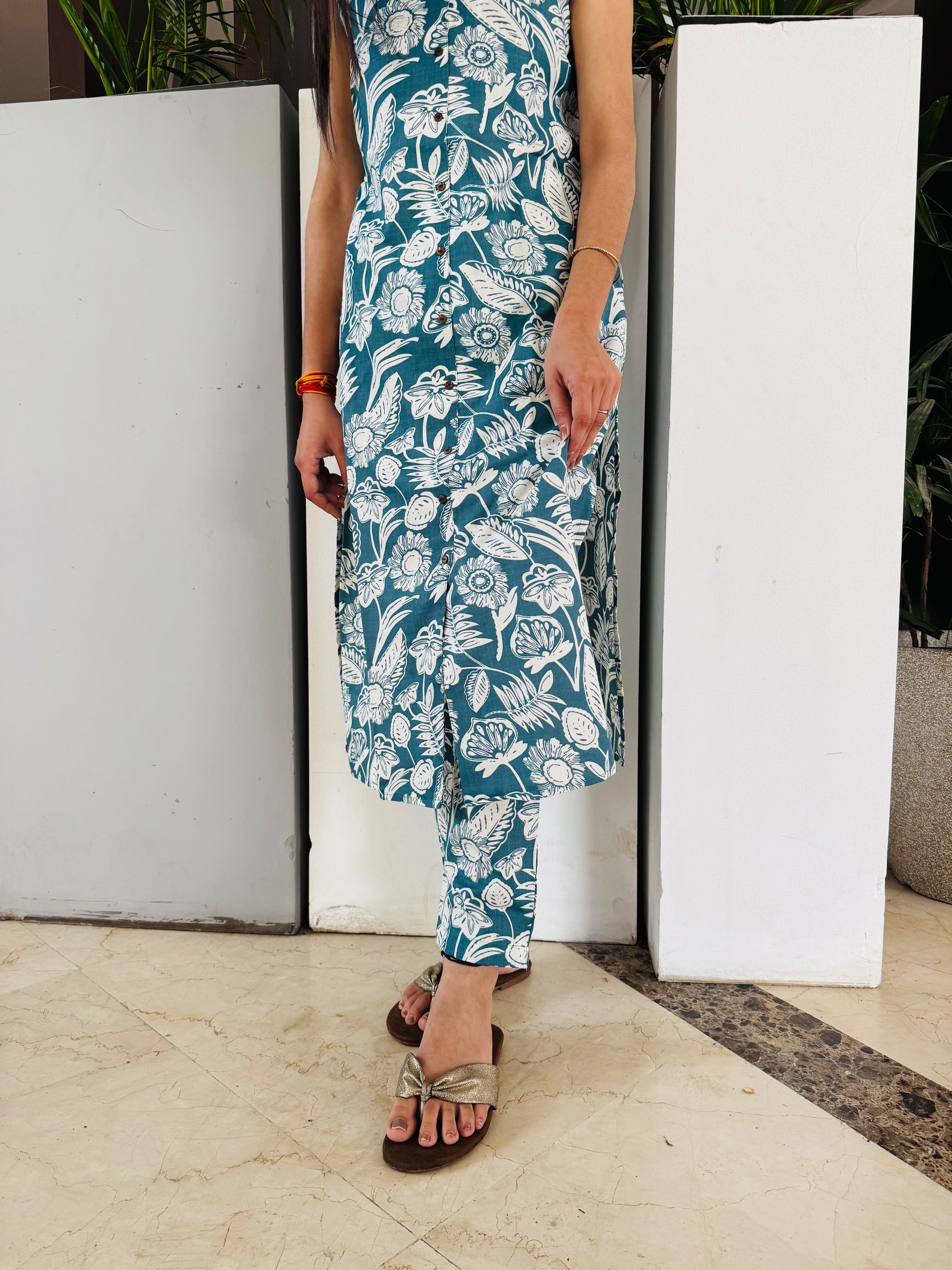 Refresh your everyday style with this versatile A-line kurta set in a stunning teal shade, adorned with a crisp white botanical print. Crafted from 100% pure cotton, this set is designed to keep you cool and comfortable throughout the day.