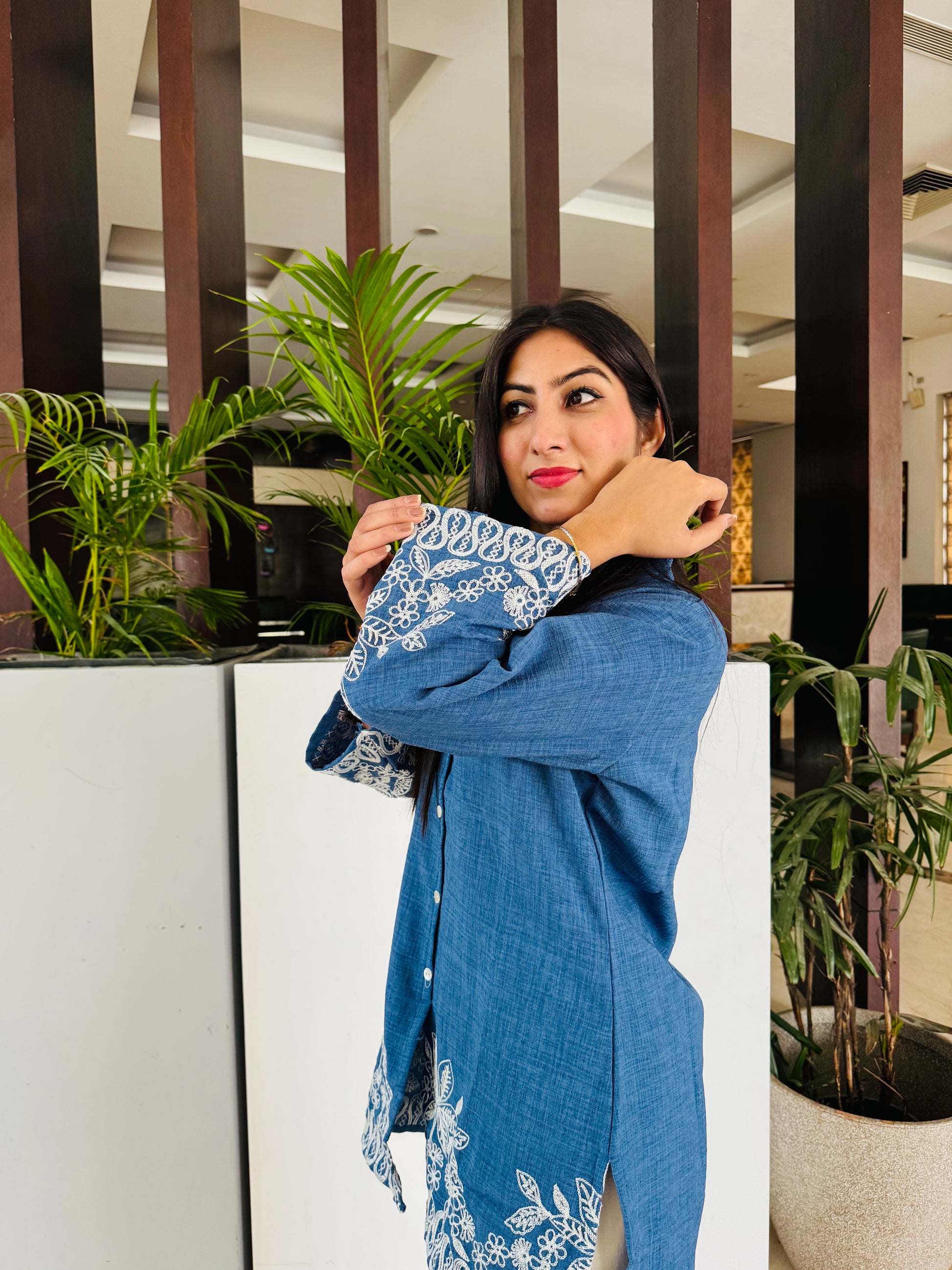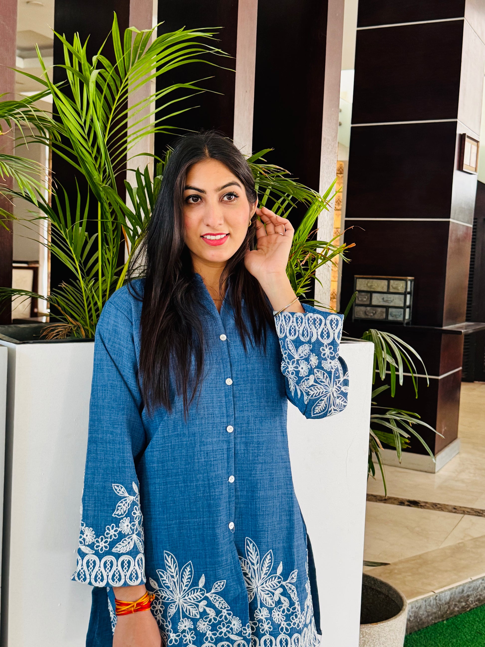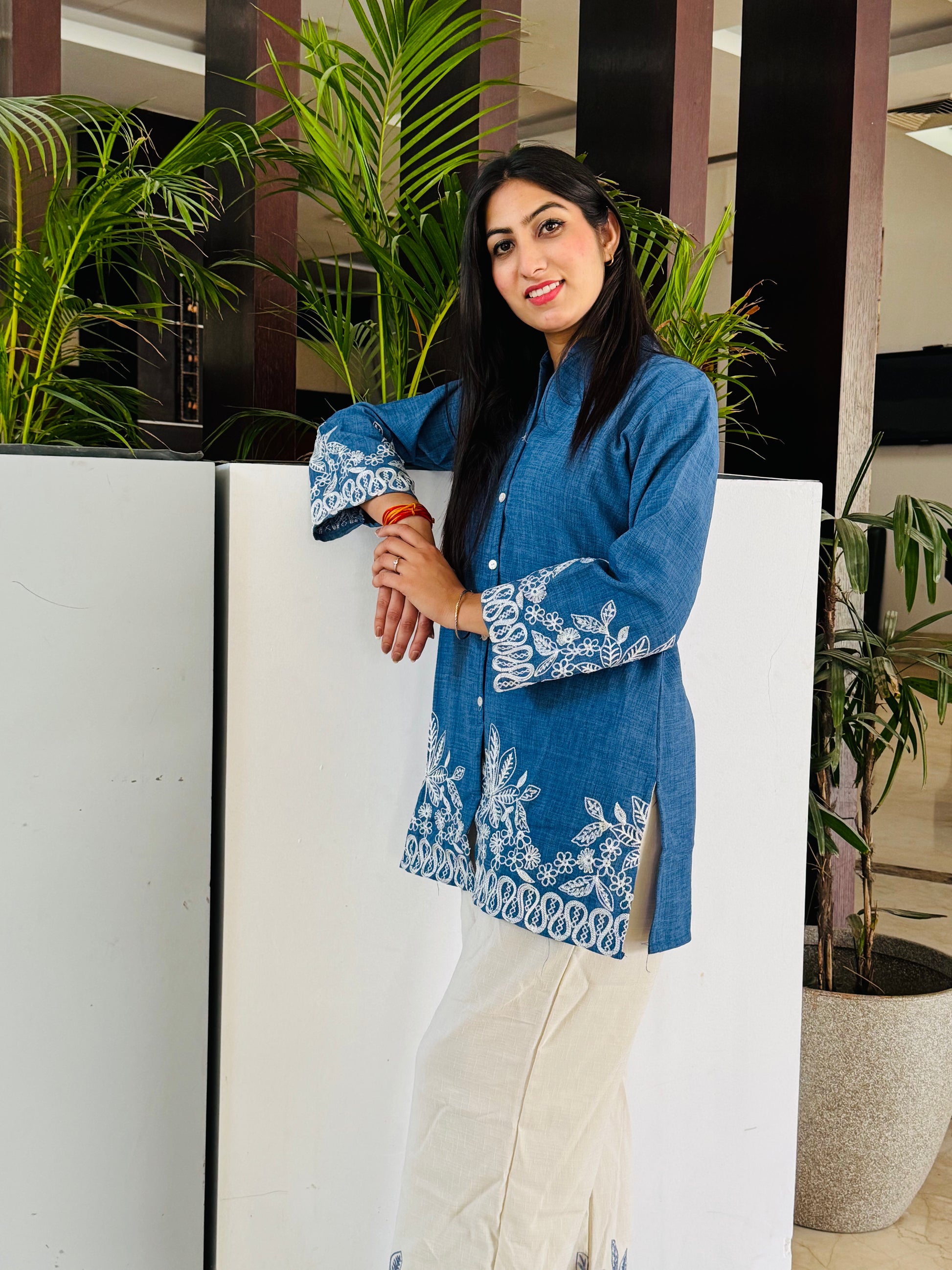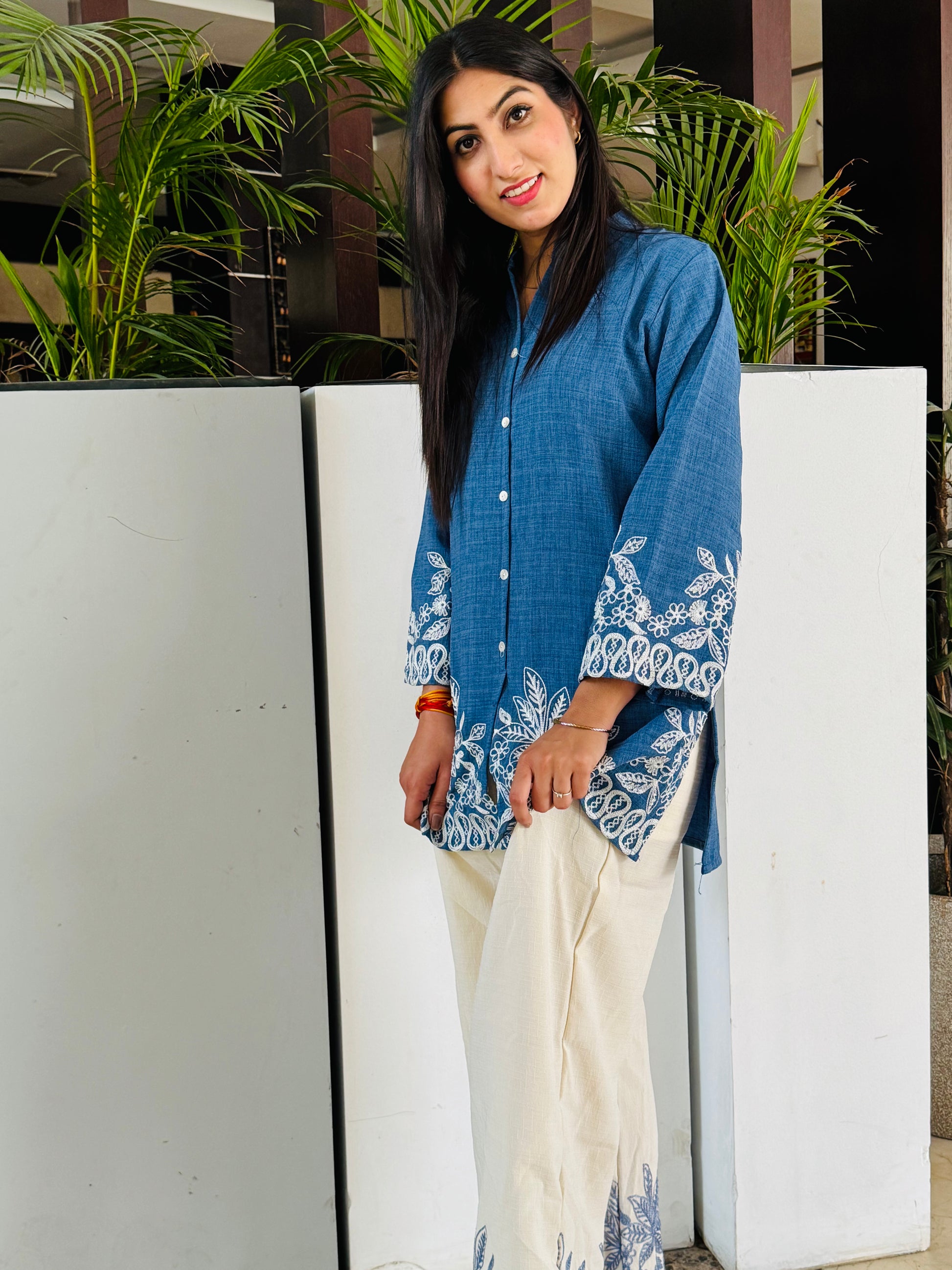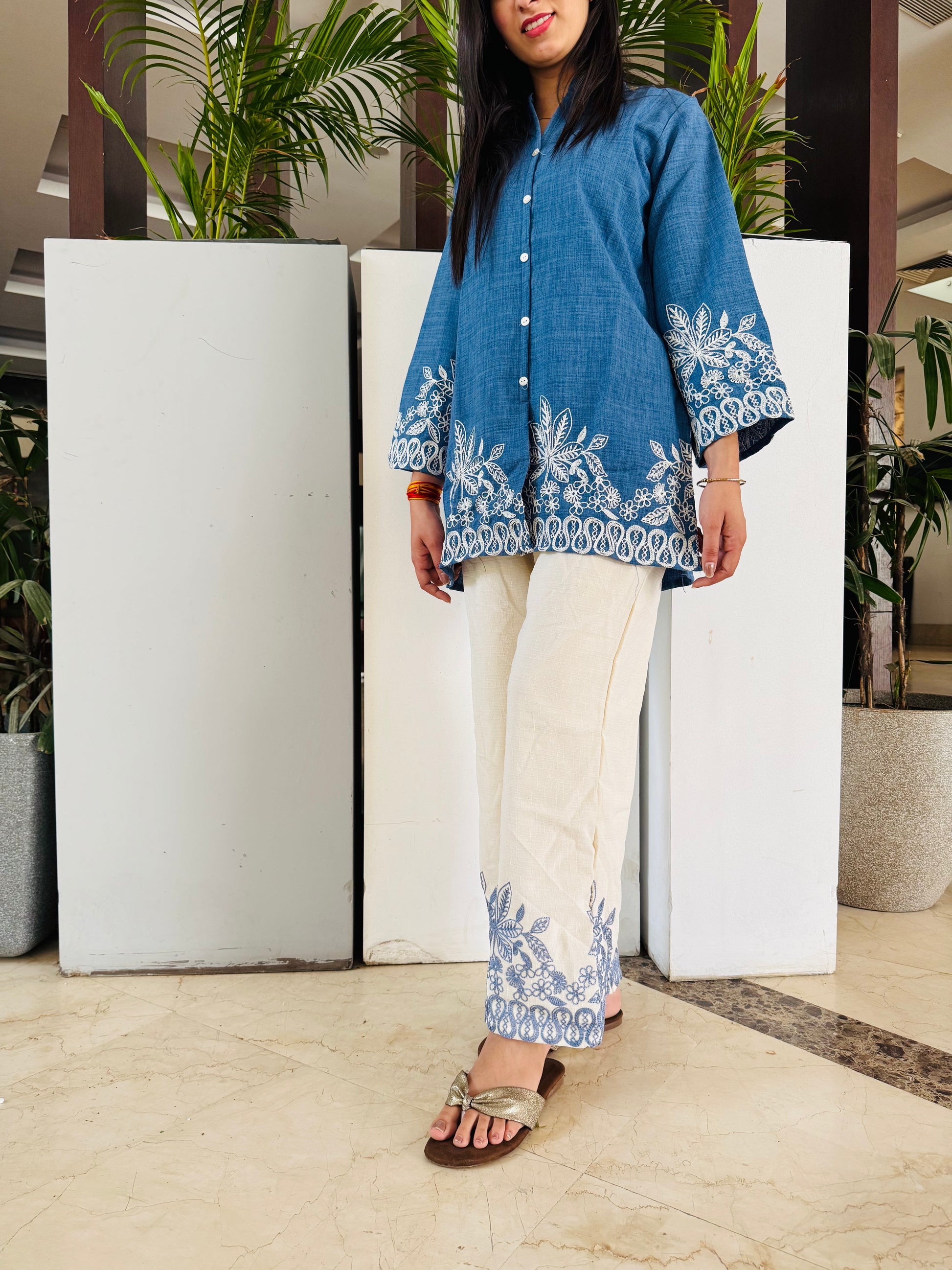 • Color: Contrasting threadwork — white embroidery on the blue kurta, and blue embroidery on the off-white pants